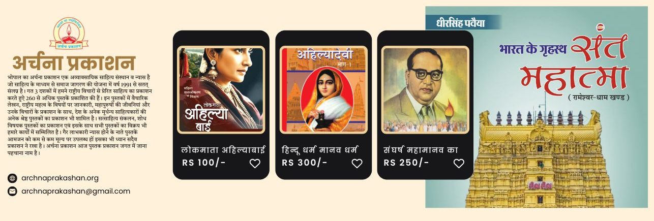 भोपाल का अर्चना प्रकाशन एक अव्यावसायिक साहित्य संस्थान व न्यास है जो साहित्य के माध्यम से समाज जागरण की योजना में वर्ष 1991 से सतत् संलग्न है। गत 3 दशकों में हमने राष्ट्रीय विचारों से प्रेरित साहित्य का प्रकाशन करते हुऐ 260 से अधिक पुस्तकें प्रकाशित की हैं। इन पुस्तकों में वैचारिक लेखन, राष्ट्रीय महत्व के विषयों पर जानकारी, महापुरुषों की जीवनियां और उनके विचारों के प्रकाशन के साथ, देश के अनेक मूर्धन्य साहित्यकारों की अनेक श्रेष्ठ पुस्तकों का प्रकाशन भी शामिल है। सत्साहित्य संकलन, शोध विषयक पुस्तकों का प्रकाशन एवं इसके साथ सभी पुस्तकों का विक्रय भी हमारे कार्यों में सम्मिलित है। गैर लाभकारी न्यास होने के नाते पुस्तकें आमजन को कम से कम मूल्य पर उपलब्ध हों इसका भी ध्यान सदैव प्रकाशन ने रखा है। अर्चना प्रकाशन आज पुस्तक प्रकाशन जगत में जाना पहचाना नाम है।